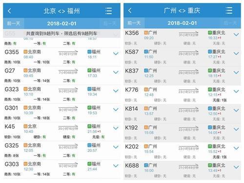 记者通过12306客户端浏览余票,北京至福州余票较多,广州至重庆则已基本售罄。