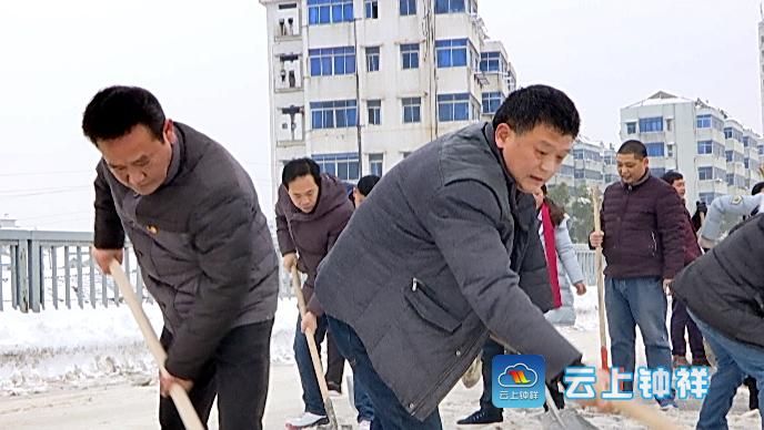 党旗下,全体党员干部职工正奋力清除积雪。