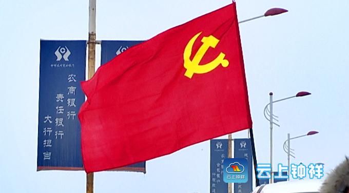 大桥上,鲜红的党旗和党员先锋队队旗在寒风中飘扬。