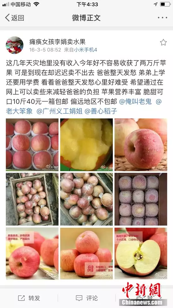 “当时我发的是微博,图文结合且把苹果滞销的情况简单做了介绍。我就抱着试试的想法,在微博上发了一组我家果园的照片,没想到第一单就接了顾客定的20箱苹果。”李娟说,就这样一次偶然的尝试,让她开启了自己的电商之路。一年多的时间,李娟在微信平台卖出了3万公斤水果,不仅解决了家里的经济困难,也成了远近闻名的“励志网红”、“电商女孩”。