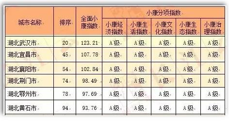 此次,湖北上榜百强名单的11个城市中,有8个城市的全面小康指数高于97 。全面小康指数最高的城市为湖北武汉,达到123.21 !