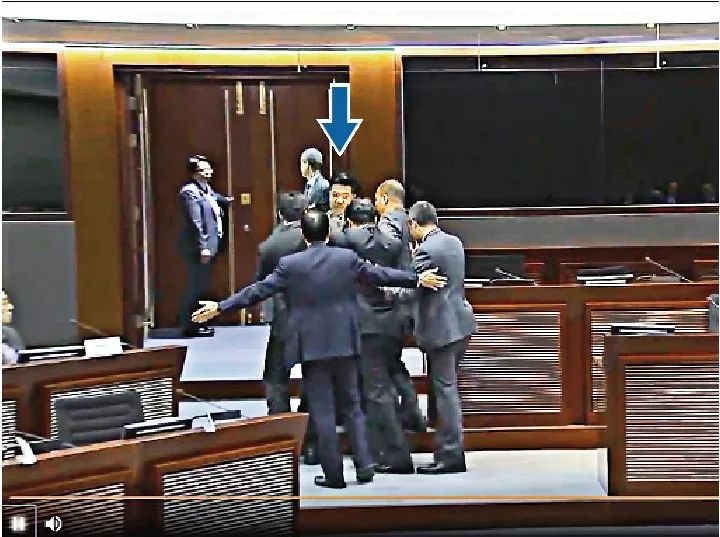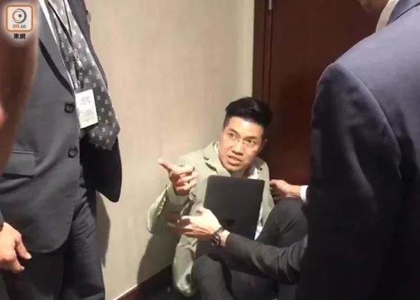 范国威被保安驱逐离开会议厅,其间一度推撞保安员至双双倒地/电视截图