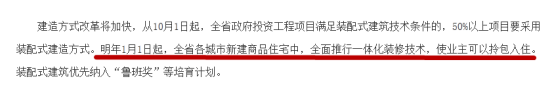 4月13日,湖北省人民政府网公开了《省人民政府关于促进全省建筑业改革发展二十条意见》(简称《意见》)。《意见》第4点“深化建造方式改革”中提出——从2018年10月1日起,全省政府投资工程项目满足装配式建筑技术条件的,50%以上项目采用装配式建造方式。2019年1月1日起,湖北省各城市新建商品住宅中,全面推行一体化装修技术。