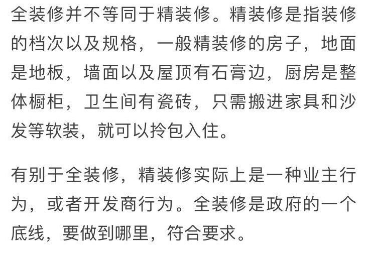 住建部2002年出台的《商品住宅装修一次到位实施细则》中解释:所谓全装修,是指房屋交钥匙前所有功能空间的固定面全部铺装或粉刷完毕厨房与卫生间的基本设备全部安装完成。