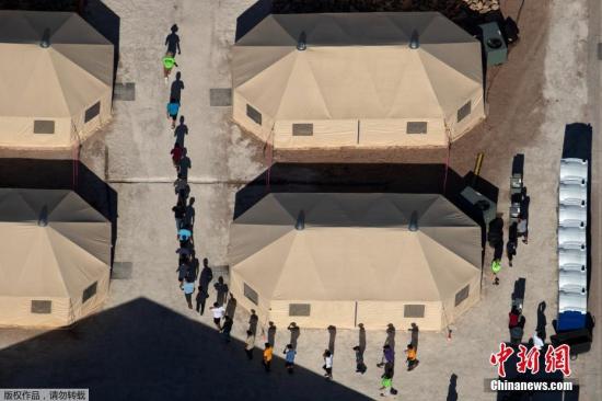 当地时间2018年6月19日,美国得克萨斯州厄尔巴索,移民儿童被安置在美墨边境新建的帐篷内。在特朗普政府对移民实施的“零容忍”政策下,六周内有近2000名儿童在美国南部边境与父母或监护人被拆散。