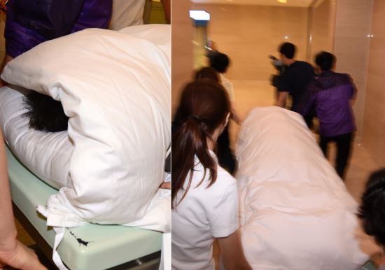 为防止记者拍摄,朴槿惠住院时被全身包裹。(韩国纽西斯通讯社)