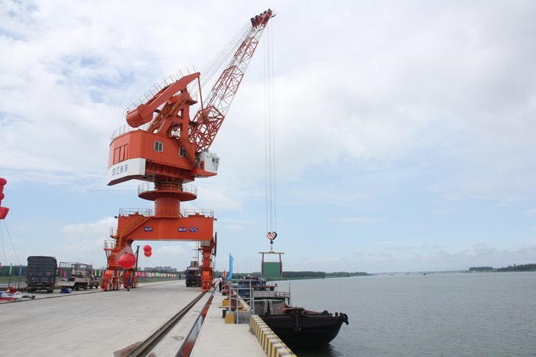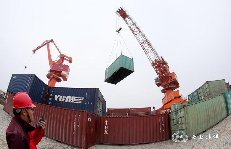 图为沙洋新港码头的门机正在紧张有序地吊装玻璃。