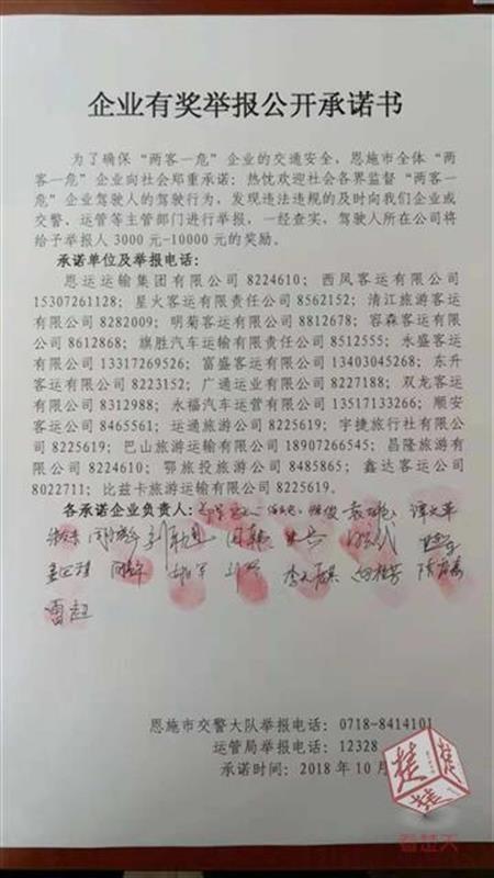 湖北恩施所有客运企业承诺对违法行为举报者最高奖励一万元,在当地产生强烈反响。10月31日,有市民向警方举报,一名公交司机驾车时玩手机长达5分钟,期间双手还多次脱离方向盘。11月2日,警方调查属实后约谈公交公司,司机被开除,举报者4日获万元奖励,成为恩施首个举报此类违法的获奖者。