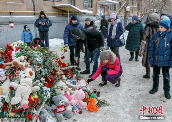 当地时间2019年1月2日,俄罗斯民众用鲜花和玩具布偶悼念在马格尼托戈尔斯克市居民楼天然气爆炸事故中受难的遇难者。