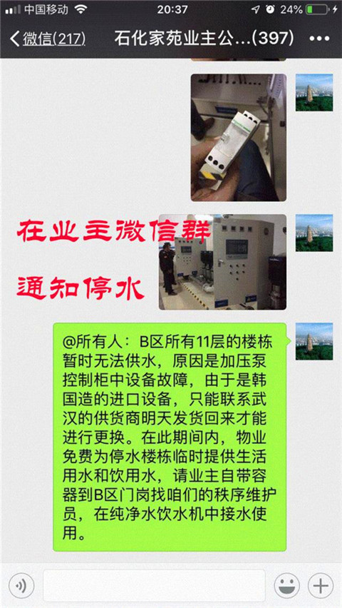 工程部丁师傅查明停水原因是加压泵控制单元中相序保护器故障,导致其中一个控制模块断电,以至于水泵无法开启。由于小区二次供水设备是韩国品牌,该零件并非易损件,也无备件,随后通知值班客服在业主微信群进行解释,为确保业主能够临时用水开启应急处置程序:小区内饮用水售卖机由物业付费,免费向停水业主提供临时饮用水及洗澡水,并安排专人帮助需要用水的业主送至家中。从事发到处理完成,项目经理杨全程在场协调各部门进入紧急预案程序,并现场进行解释安抚工作,确保小区业主们的正常起居。