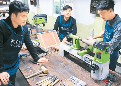 回乡创业正成为大学生就业的重要方向。上图为浙江省湖州市安吉县统里村,3名大学毕业生在工作坊内加工花器。张礼庆摄(新华社发)