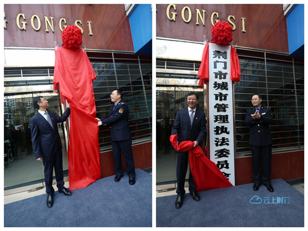 市委常委、市政府党组成员赵俊,市城市管理执法委员会党组书记张勇共同为“荆门市城市管理执法委员会”揭牌,也揭开了我市城市管理工作的新篇章。