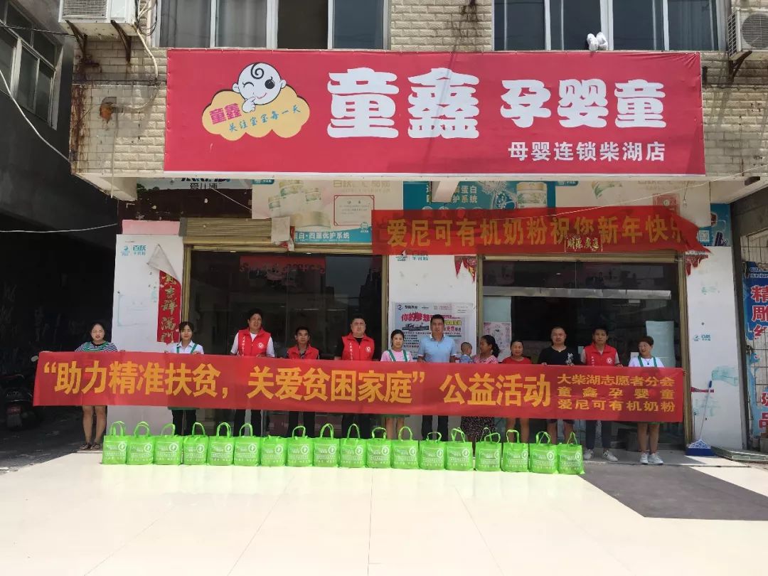 7月6号上午11时,大柴湖志愿者分会联合爱心商家童鑫孕婴童、爱尼可有机奶粉共同开展:“助力精准扶贫,关爱贫困家庭”公益活动,