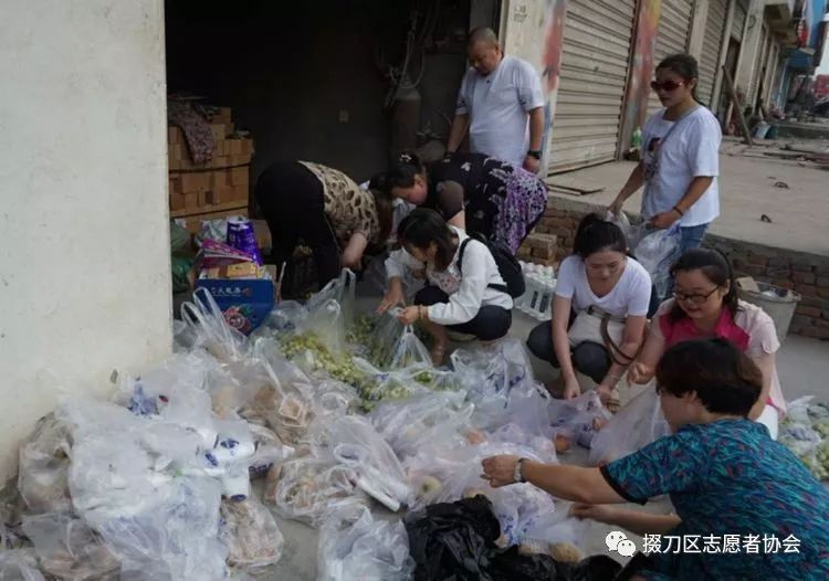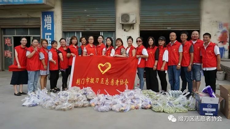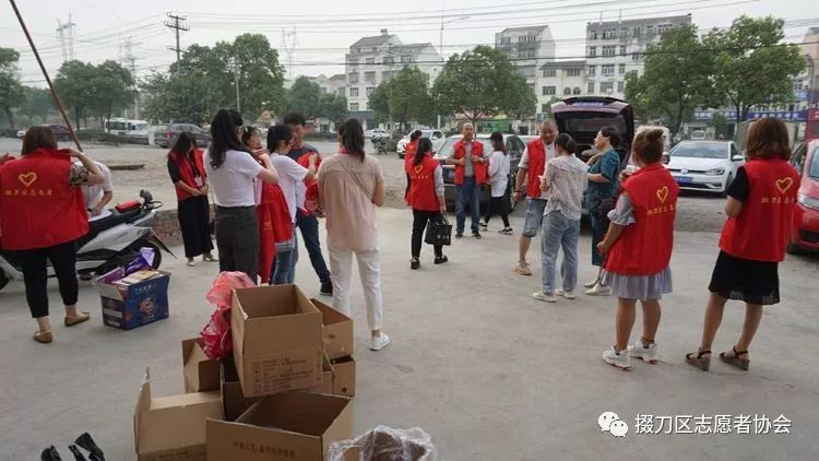 9月8日清晨6:50,志愿者们便开始从城区的四面八方赶到协会秘书长王冬苹的家里,整理分装爱心人士捐赠的慰问物资。团掇刀区委书记李虎、副书记文竹也来到集合点,和志愿者们一起帮忙分装物资。