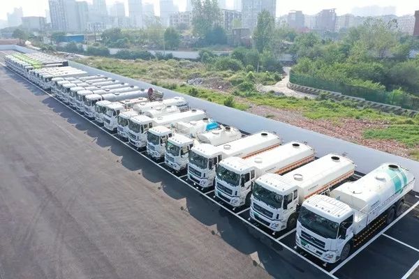 荆西环卫保洁公司基地现场,冲、洒、扫、洗等机械化作业车辆配备齐整,垃圾收集、清运设施设备规范整洁,环卫管理和作业人员精神抖擞、整装待发。