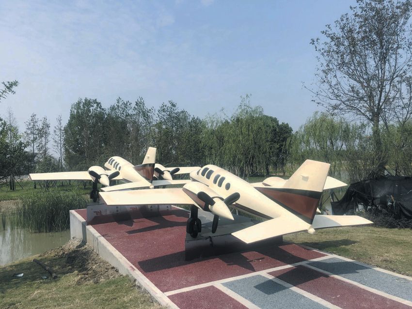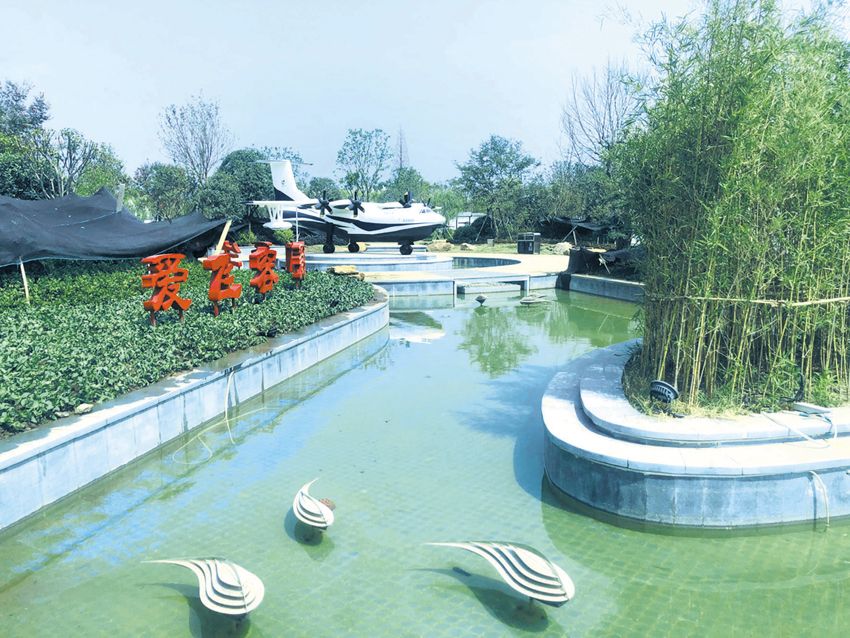 筑梦航空:以螺旋桨为元素设计喷泉水景平台,摆放1:4的“鲲龙”ag600水上飞机模型,展示在荆门漳河机场实现首飞成功的这一中国自行设计研制的大型灭火、水上救援水陆两栖飞机。