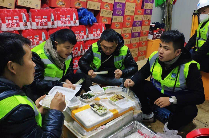城建部门和相关单位紧急调集体温计、医用外科口罩、护目镜、防护服等防护设备,尽最大努力保障施工人员的安全及后勤,但为与病毒抢时间,早日建成医院,施工人员的年夜盒饭都是在工地上吃,就一口包子或方便面,腾出更多时间搞建设。