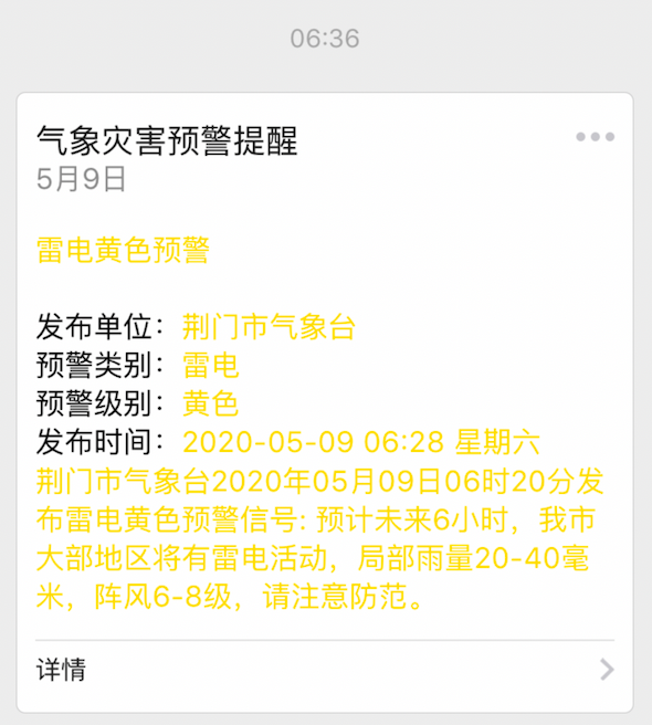 荆门市气象台2020年05月09日06时20分发布雷电黄色预警信号: 预计未来6小时,我市大部地区将有雷电活动,局部雨量20-40毫米,阵风6-8级,请注意防范。