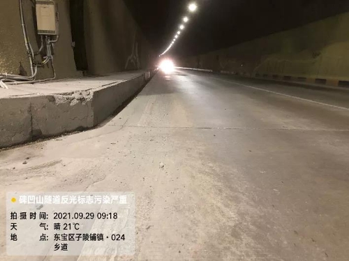 东宝区碑凹山隧道右洞反光标志泥土污染严重。