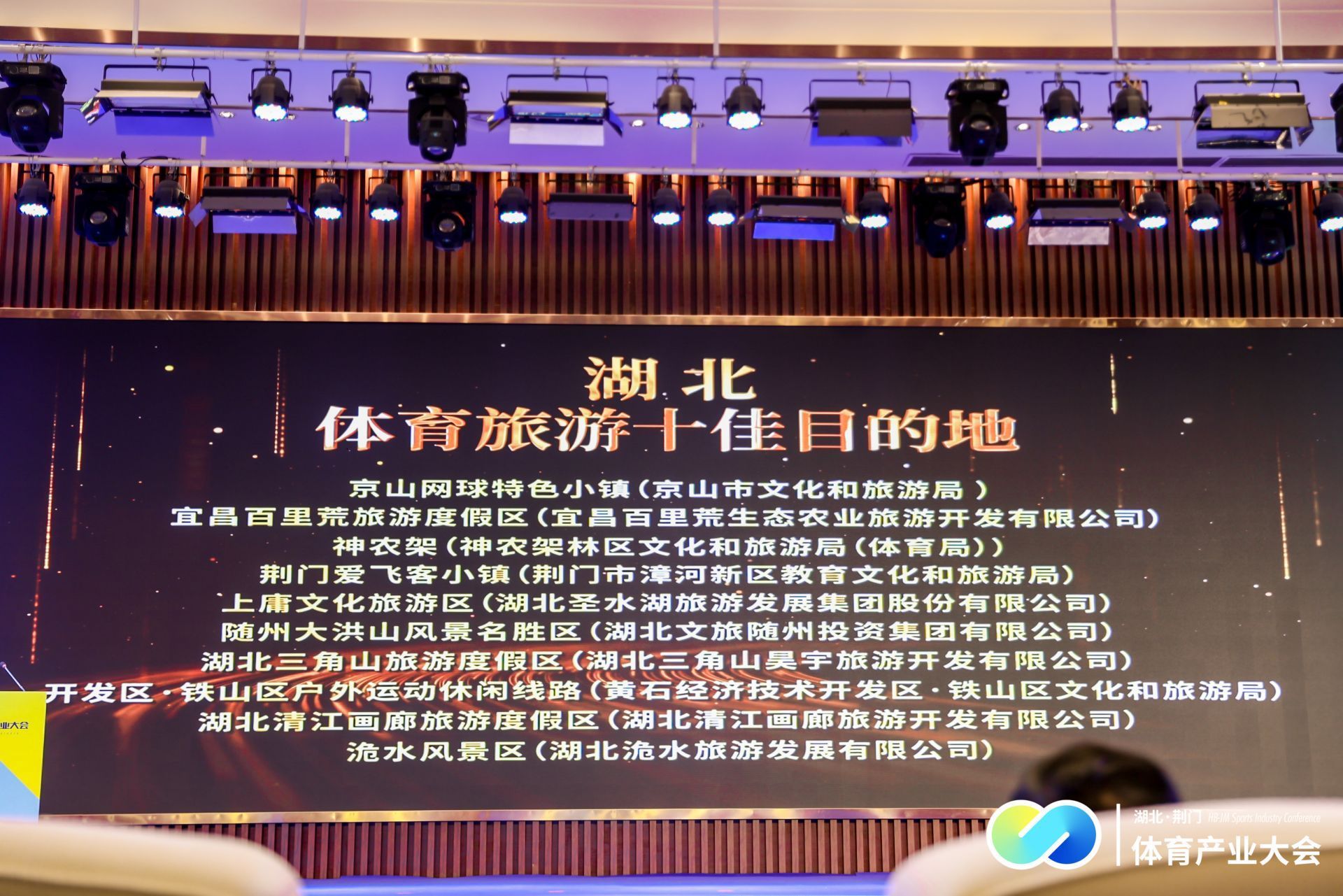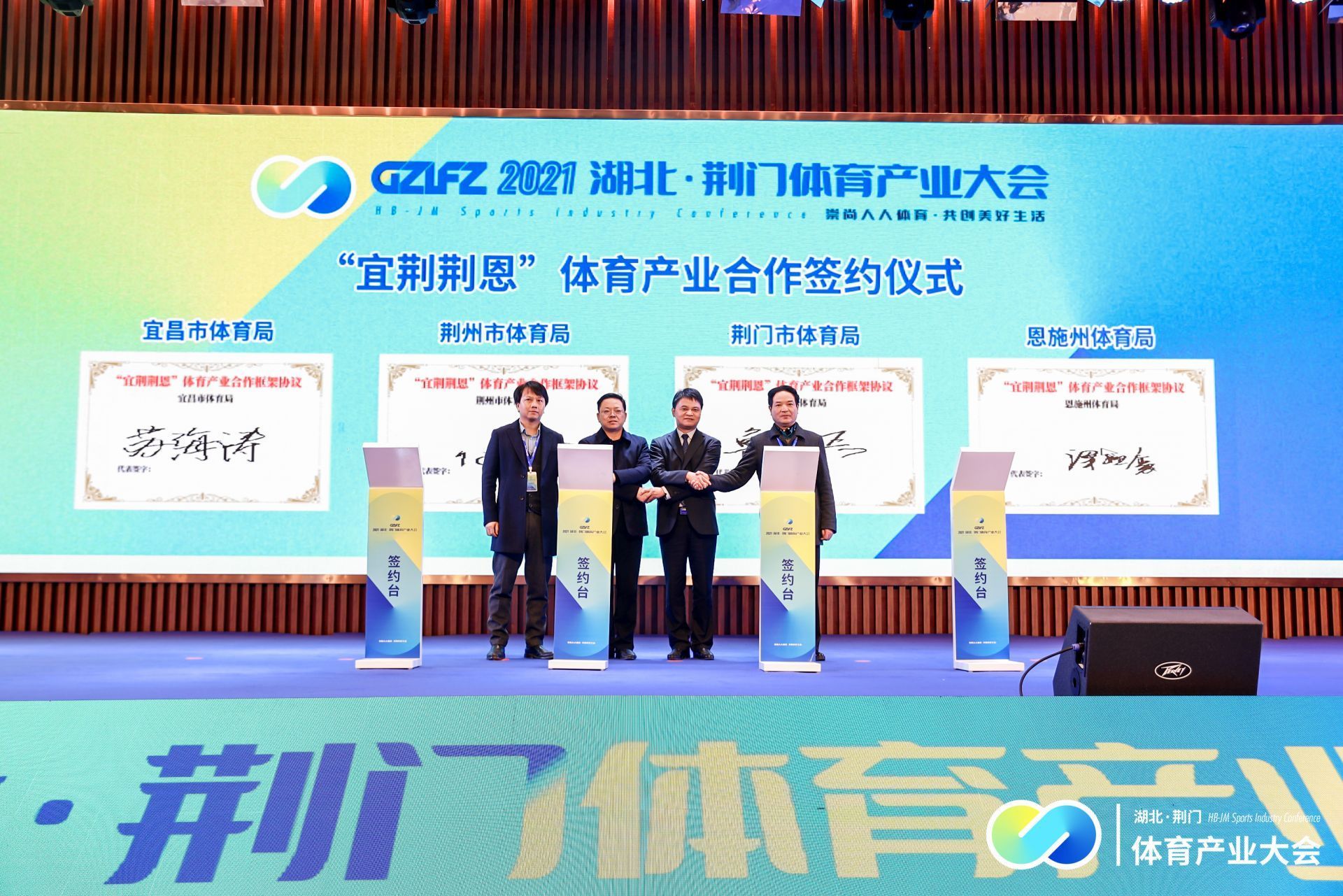 会上,与会人员一同观看了湖北·荆门体育产业大会宣传片《风起荆楚潮涌荆门》。省体育局发布了湖北省体育产业“十四五”规划、湖北体育品牌企业选树活动评选结果;胡功民为国家体育产业示范基地、示范单位、示范项目授牌;李涛、骆启义、谢继先分别为湖北省体育产业专业技能大赛获奖者颁奖;李珩、张金安分别代表荆门市人民政府和宜昌市人民政府发布了国家体育消费试点城市工作动态。沙洋县、钟祥市、京山市、东宝区分别作项目推介;宜昌、荆州、荆门、恩施四地共同签订“宜荆荆恩”体育产业合作框架协议,京山市、枝江市、巴东县、石首市共同签订“京枝巴石”体育产业合作框架协议。