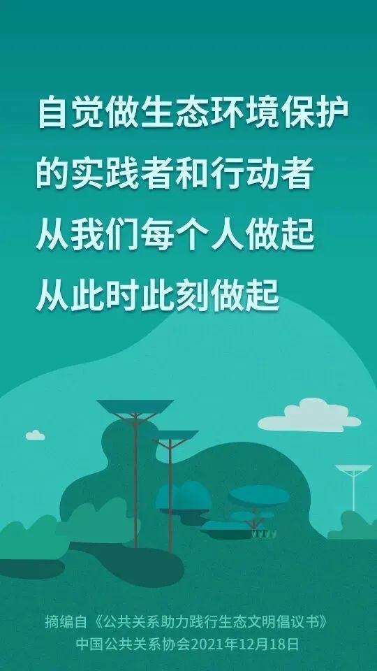 我们倡议,共做生态文明事业的坚定实践者。关注生态环境,节约能源资源,践行绿色消费,选择低碳出行,分类投放垃圾,减少污染产生,呵护自然生态,参加环保活动。坚持简约适度、绿色低碳、文明健康的生活与工作方式,自觉做生态环境保护的实践者和行动者,从我们每个人做起,从此时此刻做起。