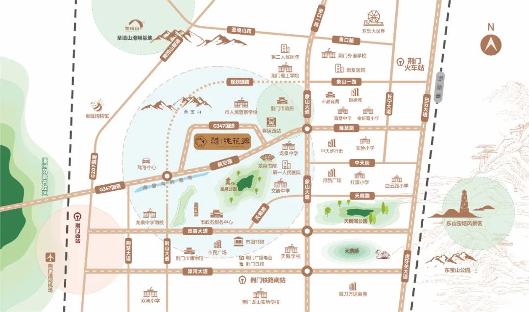 荆门桃花源选址于荆门城心东宝区,正立城市主干道航空路之侧,充分享受城市的各种功能配套,而不可复制的生态资源,则是其最为重要的价值所在。
