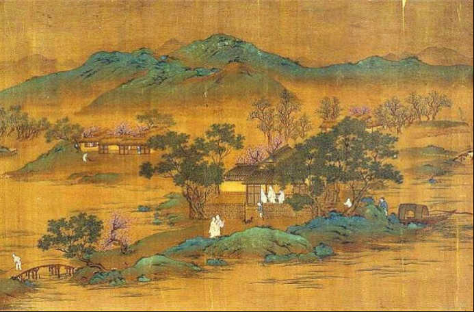 “土地平旷,屋舍俨然,有良田美池桑竹之属。阡陌交通,鸡犬相闻。其中往来种作,男女衣着,悉如外人。黄发垂髫,并怡然自乐。”