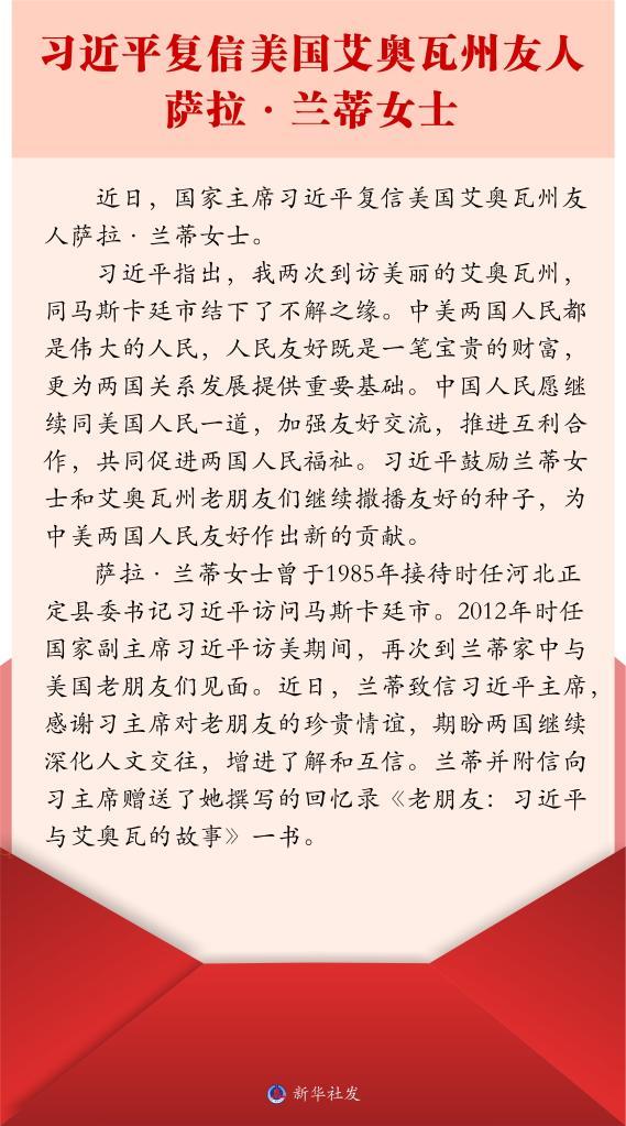 5月24日,新华社报道了习近平主席近日复信美国艾奥瓦州友人萨拉·兰蒂女士的消息。信中,习近平主席忆及两次到访艾奥瓦州的经历,鼓励兰蒂女士和艾奥瓦州老朋友们继续撒播友好的种子,为中美两国人民友好作出新的贡献。