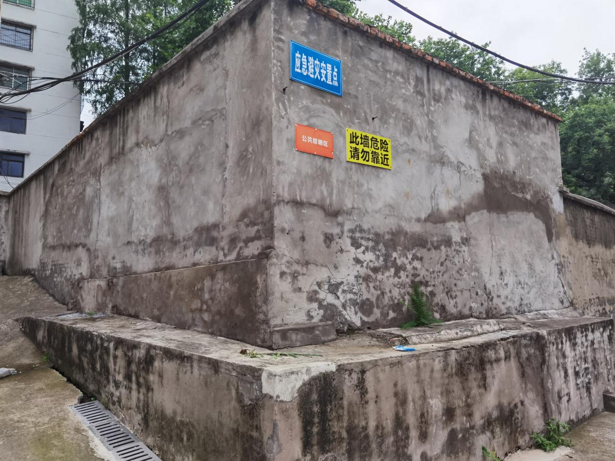 风险一:围墙下停车安全隐患。晾晒区西北有一院墙把居民楼与晾晒场分开,墙体年久倾斜裂口,在倒塌风险。此处停车安全风险极大。