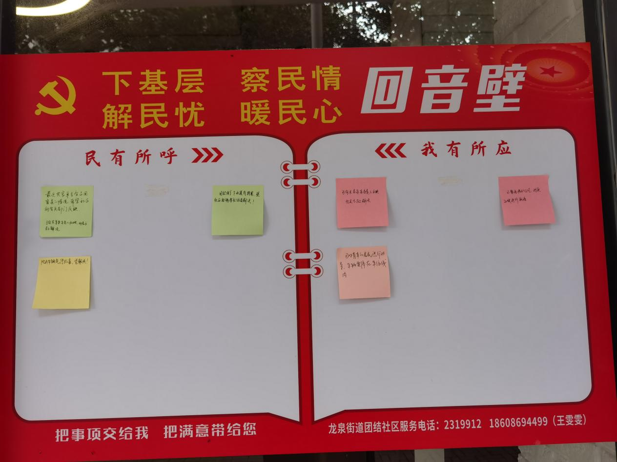 了解了一些居民有话说不出的苦衷,6月初,东宝区龙泉街道团结社区党委在党群服务中心门前设置“下基层察民情解民忧暖民心回音壁”,让一些居民有了投诉渠道。有居民匿名在《回音壁》张贴了一张要求解决陵园路停车安全隐患问题诉求纸条。