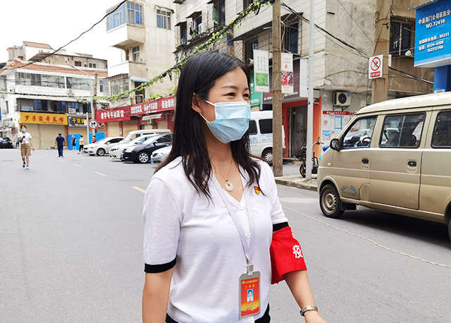 东宝区龙泉街道团结社区党委书记、居委会主任王雯雯在团结街陵园路附近查访