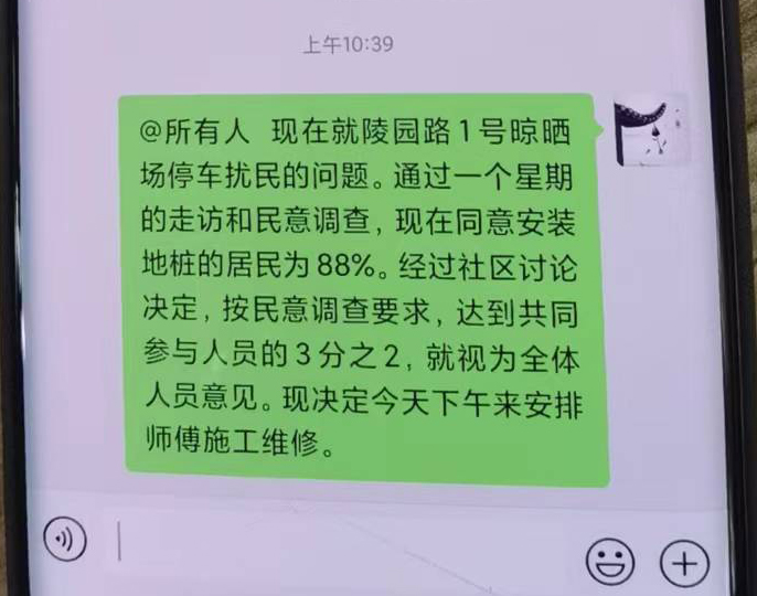 社区通过一个星期的走访和民意调查,征求全体居民意见,88%上居民同意在进入口安装一小桩,防止外面车辆进入晾晒场,并由全体居民平摊工程费用。
