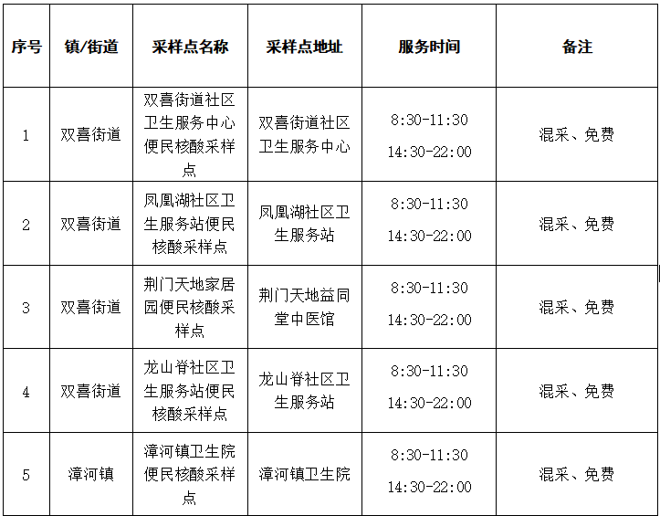 为方便广大市民合理安排时间就近核酸检测,现将漳河新区5个核酸采样点服务时间公告如下: