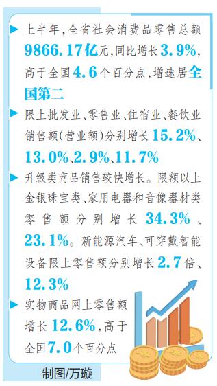上半年,全省上下统筹疫情防控和经济社会发展,积极贯彻《关于加快消费恢复提振的若干措施》,消费市场经受住疫情冲击,呈现加快恢复态势。全省社会消费品零售总额9866.17亿元,同比增长3.9%,增速居全国第二,仅次于江西。