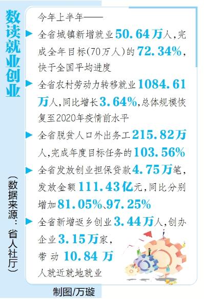据省人社厅统计,1月至6月,我省城镇新增就业50.64万人,完成全年目标(70万人)的72.34%,快于全国平均进度。其中,全省共发放创业担保贷款4.75万笔,发放金额111.43亿元,带动10.94万人就业,同比分别增加81.05%、97.25%、109.12%,格外亮眼。