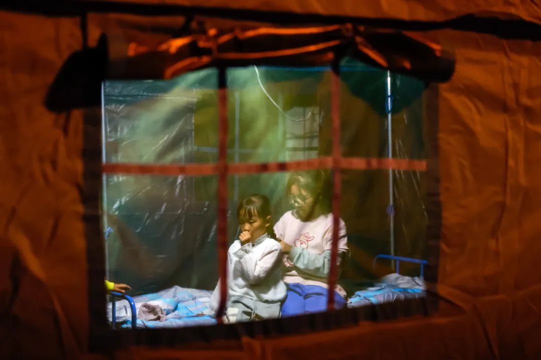9月5日晚,在四川甘孜州泸定县磨西镇受灾群众临时安置点,两名小女孩在帐篷里。新华社记者 沈伯韩 摄