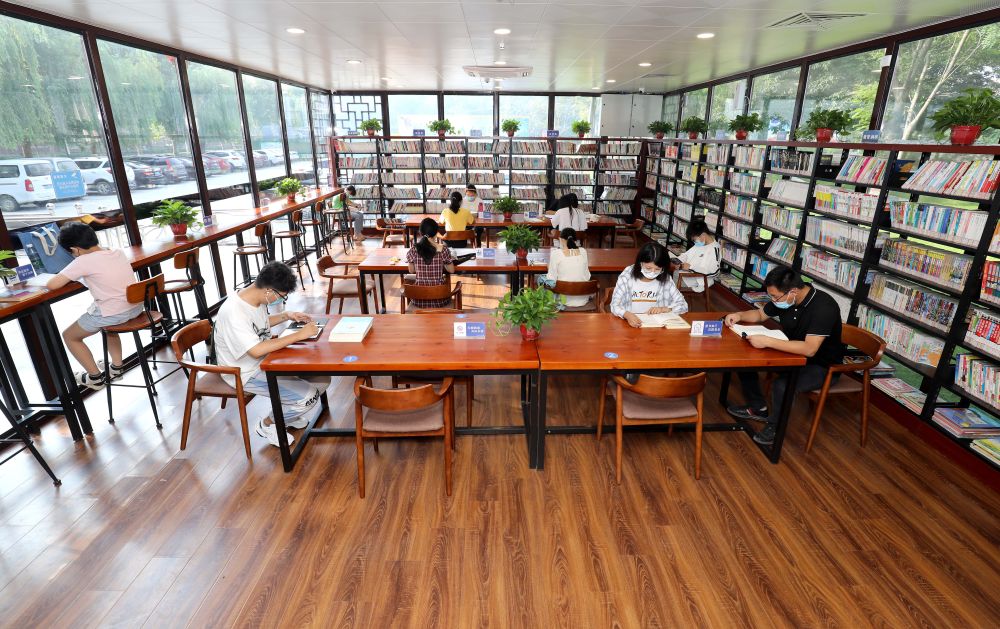 2021年8月21日,读者在河北省石家庄市藁城区人民广场“24小时智慧图书馆”内阅读。新华社记者 骆学峰 摄