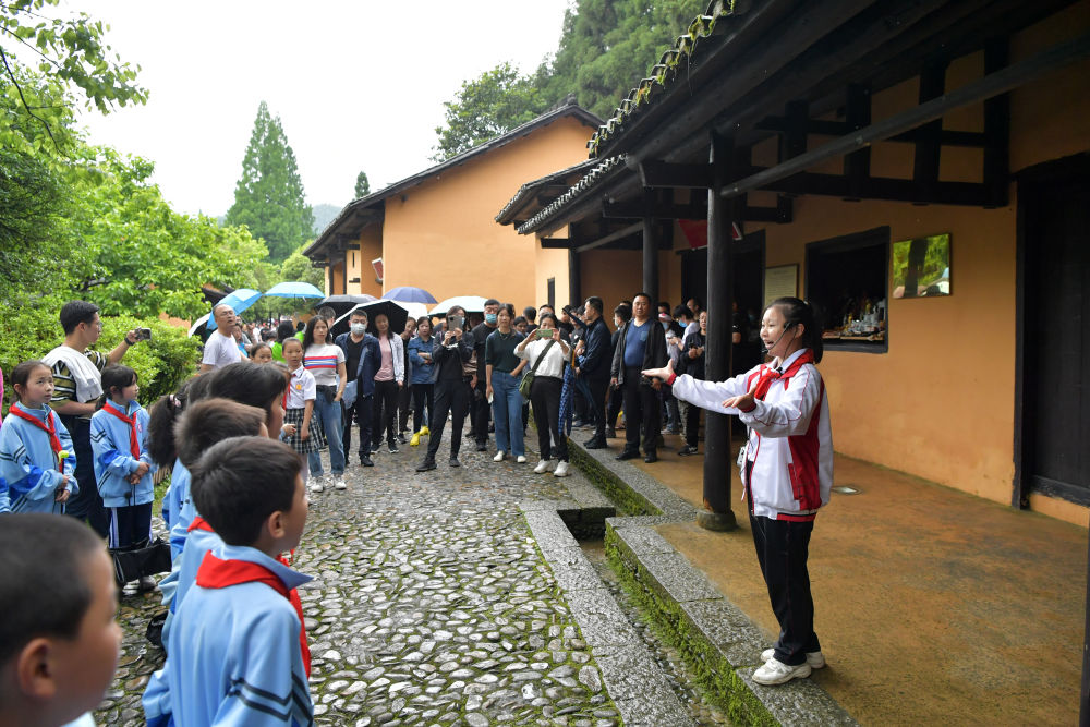 2021年5月11日,在江西省井冈山茨坪毛泽东同志旧居,“小红军宣讲团”的团长余梓洋给前来参观研学的学生们进行义务讲解。新华社记者 彭昭之 摄