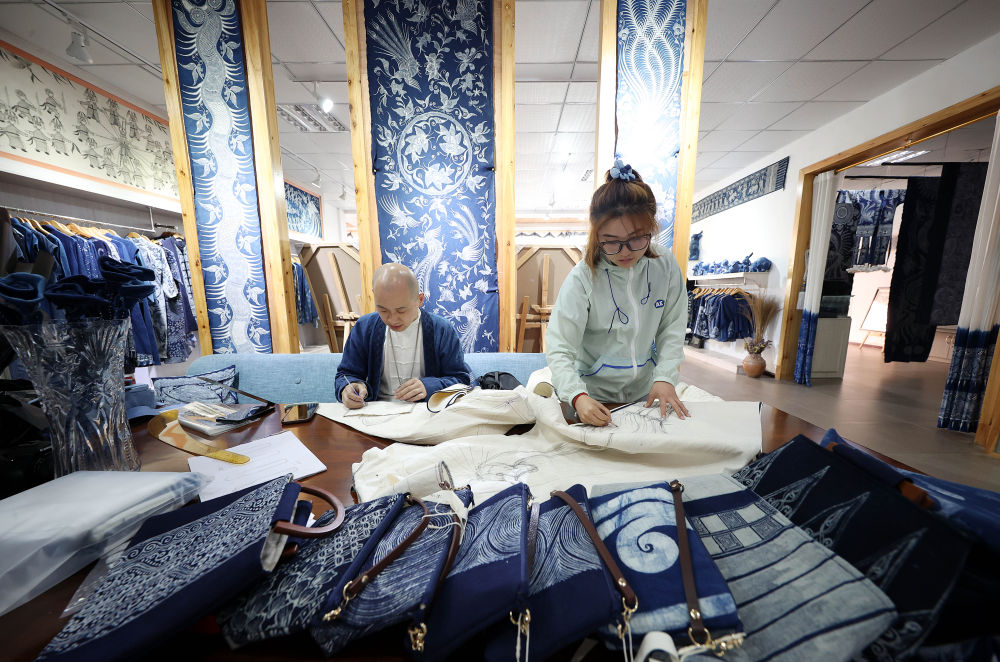 2022年4月7日,在贵州省黔东南苗族侗族自治州丹寨县宁航蜡染非遗工坊,服饰设计师在设计蜡染产品。 新华社发(黄晓海 摄)