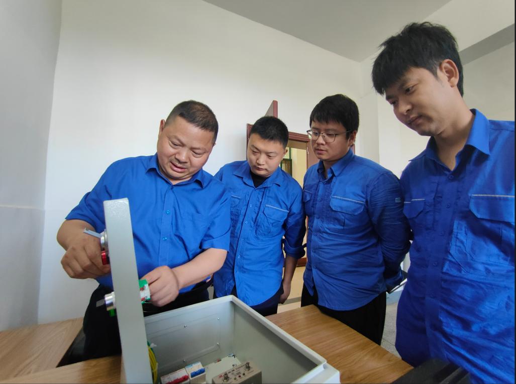 贾师傅(左一)与青年员工研究电路接驳