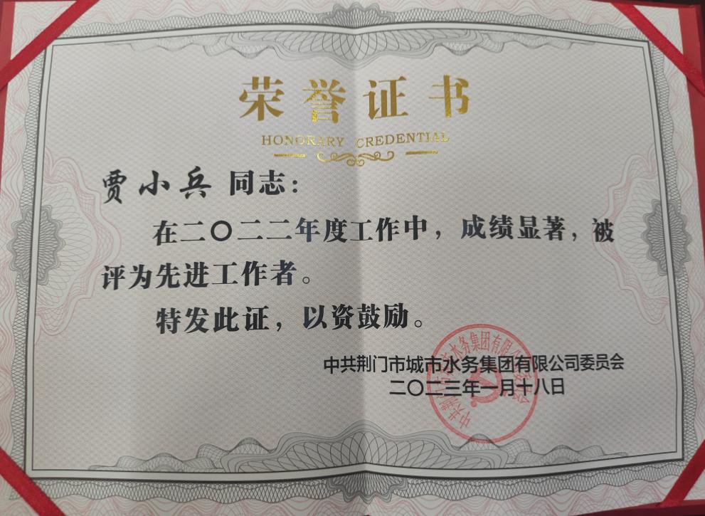 图为贾师傅获得凯发网址的荣誉证书
