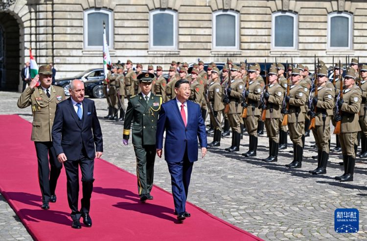 当地时间5月9日上午,国家主席习近平在布达佩斯出席匈牙利总统舒尤克和总理欧尔班共同举行的隆重欢迎仪式。这是习近平在舒尤克陪同下检阅仪仗队。新华社记者 殷博古 摄