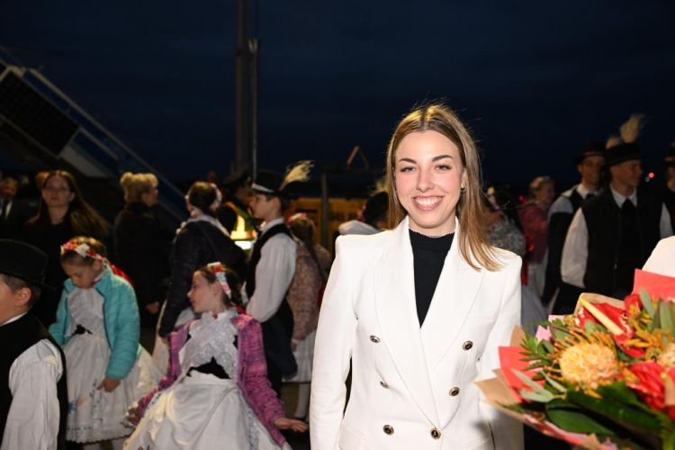 当地时间5月8日晚,在匈牙利布达佩斯国际机场欢迎队伍中的匈牙利姑娘欧拉·塔玛拉。新华社记者谢环驰摄