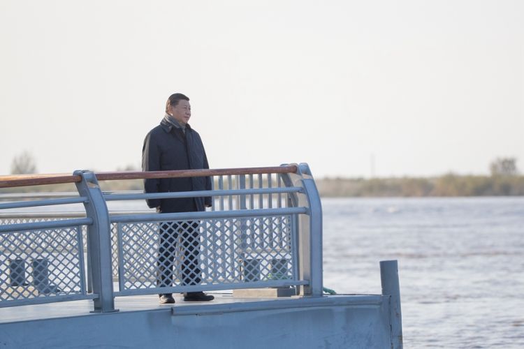 2021年10月20日,中共中央总书记、国家主席、中央军委主席习近平在东营市黄河入海口考察。新华社记者 王晔 摄