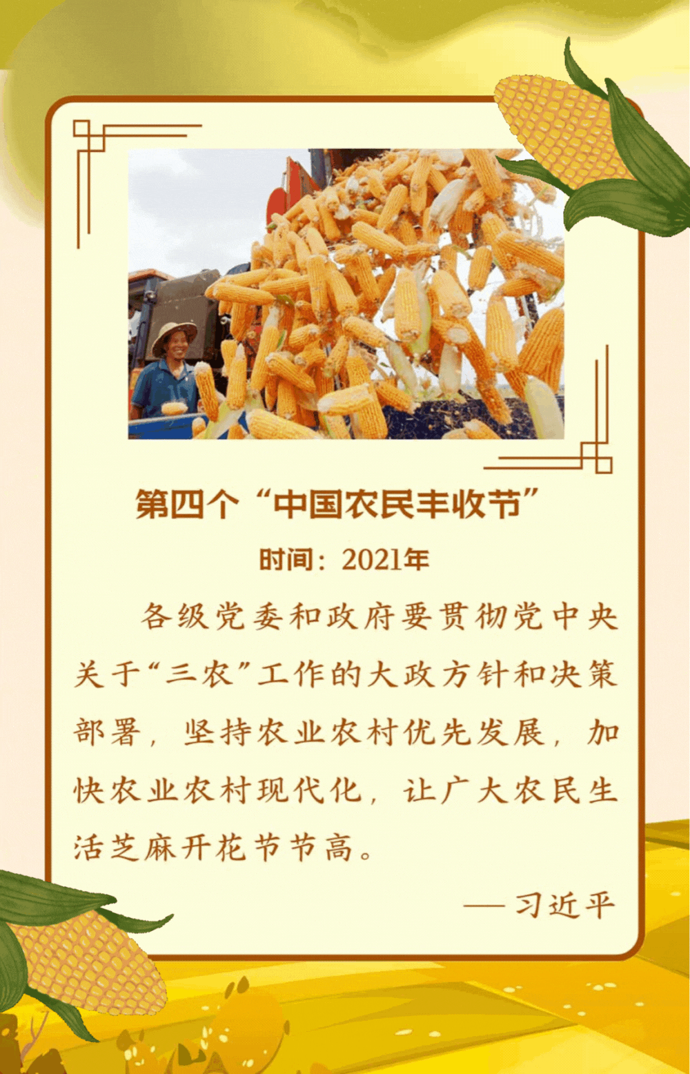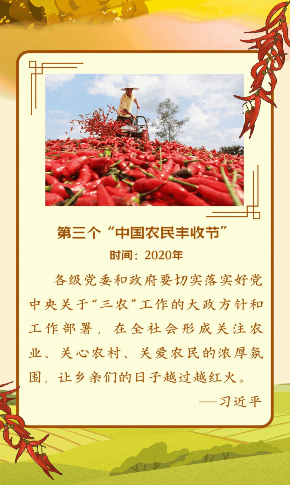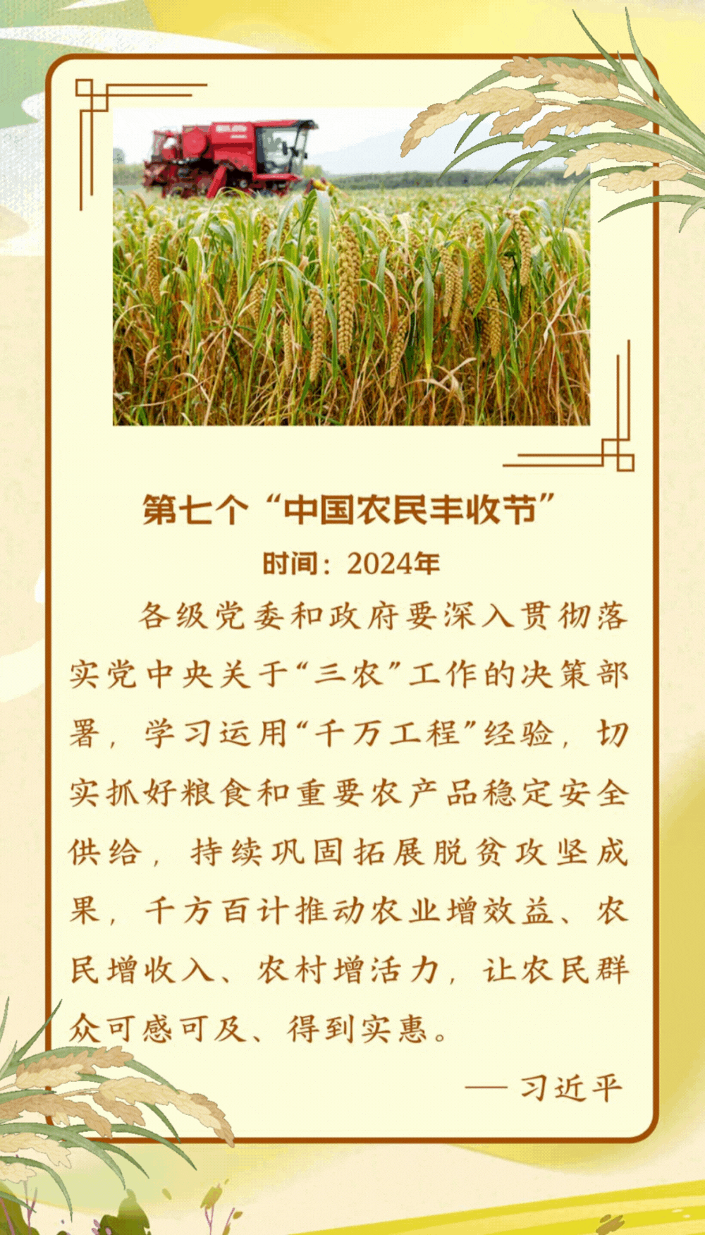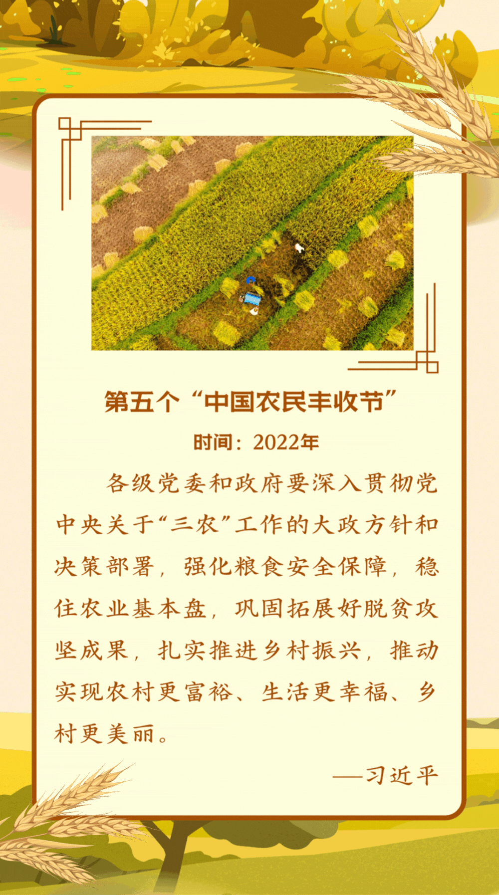 【学习进行时】第七个“中国农民丰收节”到来之际 习近平向全国广大农民和工作在“三农”战线上的同志们致以节日祝贺和诚挚问候