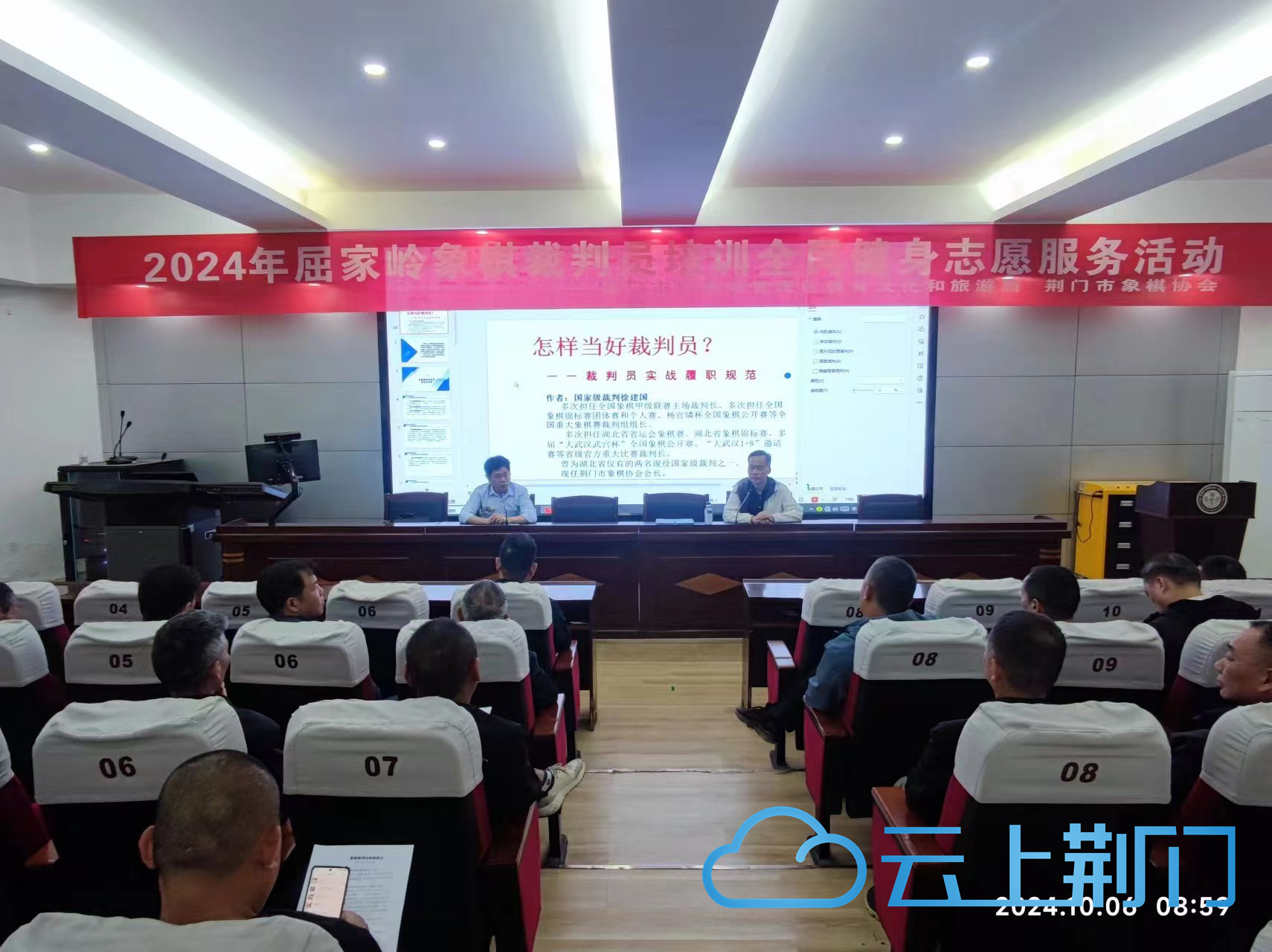 10月6日一大早,屈家岭管理区老年大学人头攒动,热闹非凡。荆门市象棋协会、荆门市屈家岭管理区教育文化和旅游局在这里联合举办“2024年屈家岭象棋裁判员培训暨荆门棋王1vs10象棋车轮战”全民健身志愿服务活动。