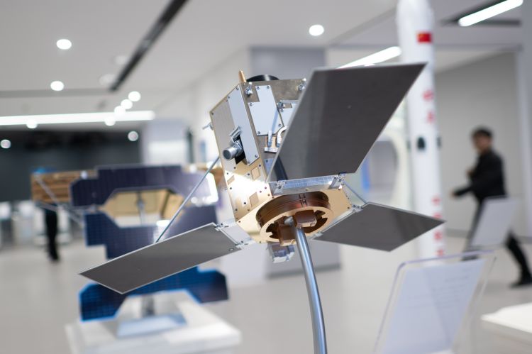 这是在“武创院”展出的“珞珈三号01星”模型。新华社记者 肖艺九 摄
