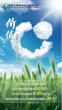 前三季度,中国人寿持续强化资产负债管理,积极推进产品多元和业务形态多元,负债质量不断优化,长期发展基础进一步夯实。十年期及以上首年期交保费保持快速增长,占首年期交保费的比重为46.43%,较2023年同期提升4.31个百分点;新业务价值保持快速增长,较2023年同期重述结果增长25.1%。