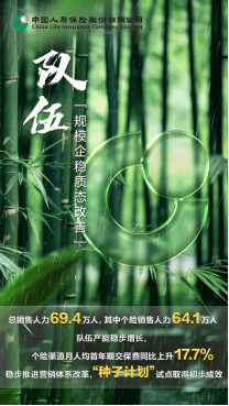 始终将深化改革作为推动高质量发展的关键一招,中国人寿稳步推进营销体系改革,深化推进现有队伍向专业化、职业化、综合化转型,着力实现队伍优增优育和产能提升。个险新型营销模式试点快速推进,“种子计划”在南京、深圳等24个城市试点,取得初步成效。