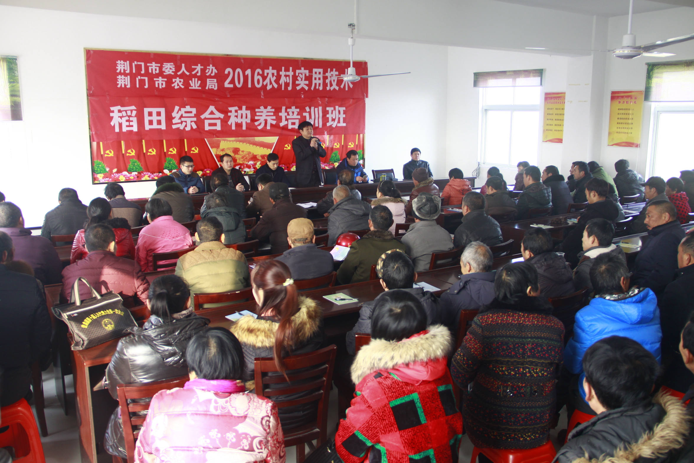 2016年12月29日,荆门市委人才办、市农业局在沙洋县曾集镇孙店村举办“稻田综合种养培训班”。荆门市水产局产业发展科科长蒋金山讲解了《稻虾共作生态种养技术》,潜江市宏霖特种养殖有限公司技术总监熊卫华传授了《黑斑蛙养殖技术》,培训班到会农户163人,包括孙店村贫困户及普通农户150人,附近高阳镇及沈集镇的农户13人。